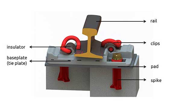 Rail clips are used to fasten the rails to the underlying baseplate.