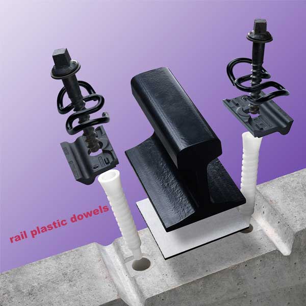 Rail plastic dowel is also called rail plastic sleeve/plastic insert/concrete dowel/ concrete insert, which is a counter-party fastener for a sleeper screw or anchor bolt, and it is pre-imbedded into the concrete or wooden sleeper tie, installed together with screw spikes, guide plates and rail clips to fasten the rail tracks.